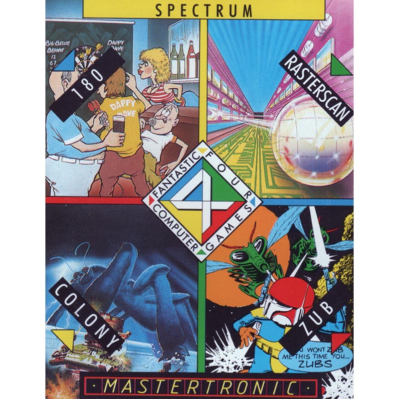 For 48K Spectrum. 2 cassettes in double jewel case containing: 180, Rasterscan, Colony and Zub. MASTERTRONIC
